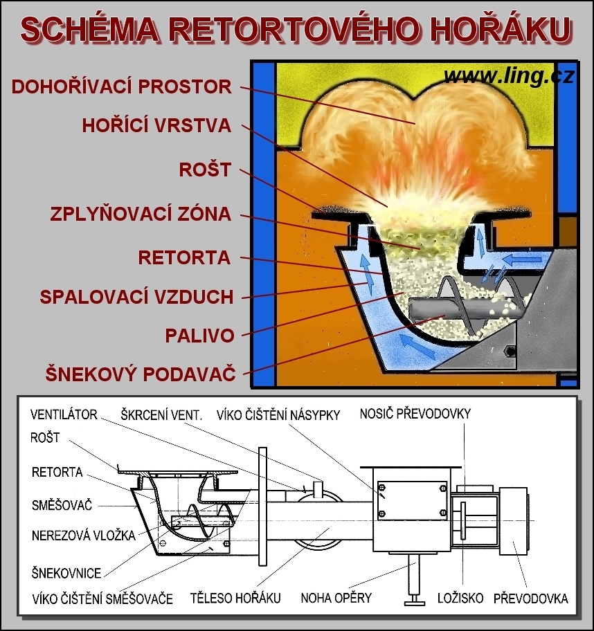 PRINCIP HOŘÁKU ........... retortové hořáky pracují na principu tzv. „spodního přikládání“. Palivo je dopravováno šnekovým dopravníkem ze zásobníku do topeniště, zde je zespodu nahoru vyhrnováno na rošt, kde postupně vyhořívá. K tomuto vyhrnování musí docházet pomalu – tím, jak se palivo postupně blíží k hořící vrstvě, dochází k jeho nahřívání a postupnému uvolňování prchavé hořlaviny (podle druhu paliva se hořlavina uvolňuje již v rozmezí teplot 150–200 °C). Uvolněná „prchavka“ prochází hořící vrstvou, kde dochází k jejímu zapálení a pak dohořívá v tzv. dohořívacím prostoru (spalovacím prostoru). Hořící vrstvu tvoří odplyněné pevné zbytky paliva (koks), které dohořívají na roštu. Pod rošt je přiváděn spalovací vzduch, který vyhořívání koksu podporuje (rozdmýchává hořící vrstvu podobně jako kovářská výheň). Pevné zbytky po spalování (popel, škvára) jsou postupně vytlačovány na hranu roštu a poté přepadávají do popelníku. Rošt i retorta jsou vyrobeny z litiny, která jednak odolává vysokým teplotám, jednak dobře akumuluje teplo, takže vytváří v retortě příznivé prostředí pro zplyňování paliva. Množství spalovacího vzduchu (resp. intenzita rozdmýchávání paliva) je regulováno škrtící klapkou na ventilátoru. Palivo je do spalovací části hořáku dodáváno v cyklech, které jsou nastavitelné v regulátoru. Hořák se v automatickém provozu zapíná a vypíná podle požadované teploty topné vody (nastavitelná kotlovým termostatem) nebo podle potřeby tepla v referenční místnosti (externím regulátorem – např. prostorovým termostatem).