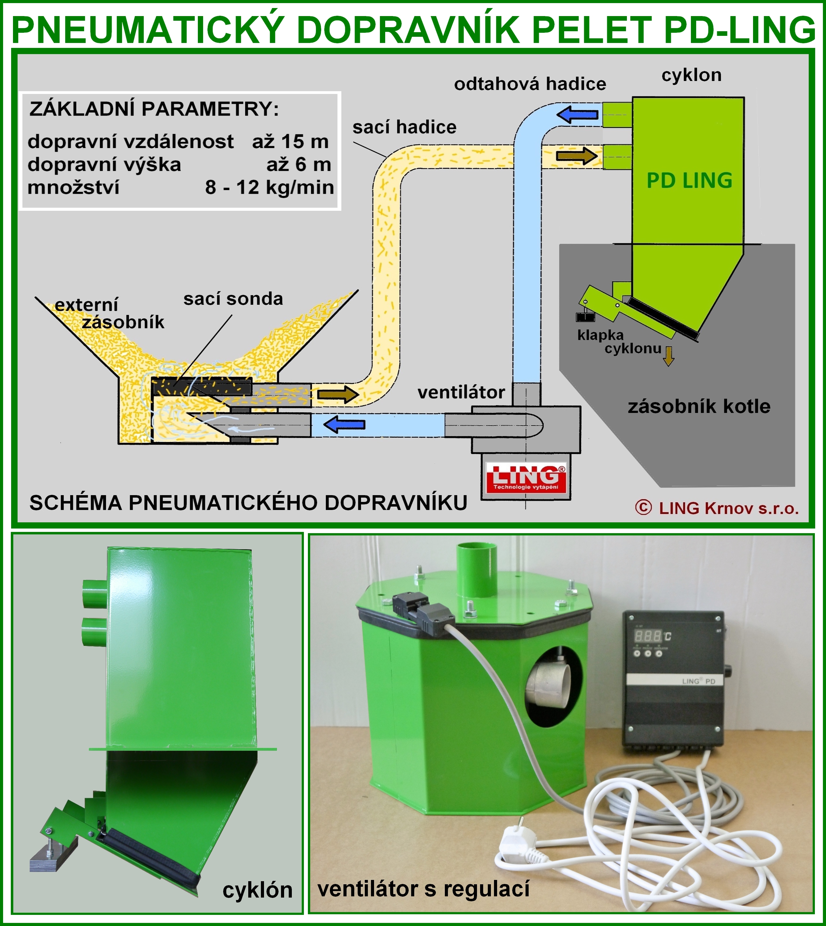 Pokud se Vám nechce namáhavě doplňovat zásobník paliva u Vašeho peletového kotle průběžně z malých 15 kg pytlů, jedním z nejlepších řešení je instalace pneumatického dopravníku pelet PD LING, který automaticky zásobuje kotel průběžně z centrálního skladu pelet (individuálně upravená místnost, textilní zásobník TZ LING, kontejnerové zásobníky KZ LING). Na zásobník Vašeho kotle se nainstaluje cyklon dopravníku s regulací. Ten je antistatickými hadicemi propojen se sběrnou sondou (nebo více sondami) v centrálním zásobníku. Na výfukovém potrubí mezi cyklonem a sběrnou sondou je zabudován ventilátor, který vyvolává v cyklonu podtlak, díky kterému jsou do cyklonu pelety sacím potrubím nasávány. Po naplnění cyklonu se nasávání přeruší, cyklon se vyprázdní do zásobníku a spustí se nasávání nové. Během několika minut tak lze doplnit do kotlového zásobníku pelety na několikadenní provoz z centrálního skladu, který může být od kotle vzdálen až 15 metrů.